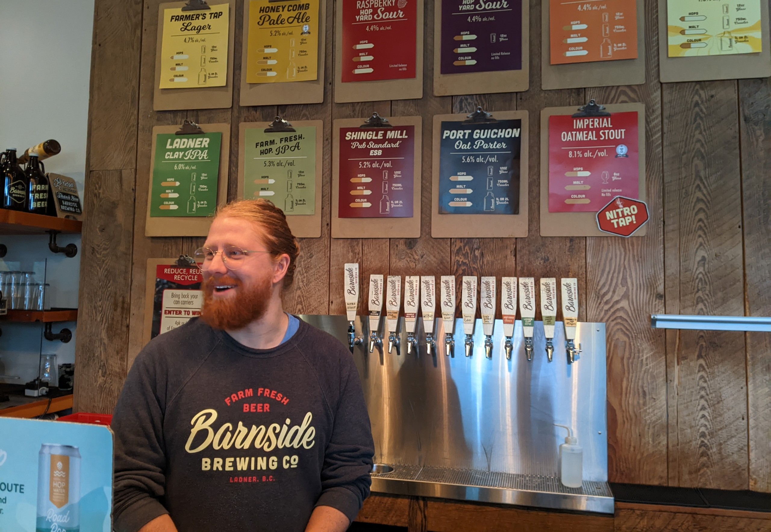 The farming spirit of collaboration can be seen among the brewery employees. Barnside employs two dozen staff, and chances are you’ll be served by multiple cheery members of the tasting room staff while visiting. The tasting room’s kitchen was recently expanded and often features a line of three cooks turning out comfort food and snacks, including Ladner lox flatbread, an in-house hopped cheese board, and—Malenstyn’s favourite—the Farmhouse Grilled Cheese Sandwich (*add bacon).