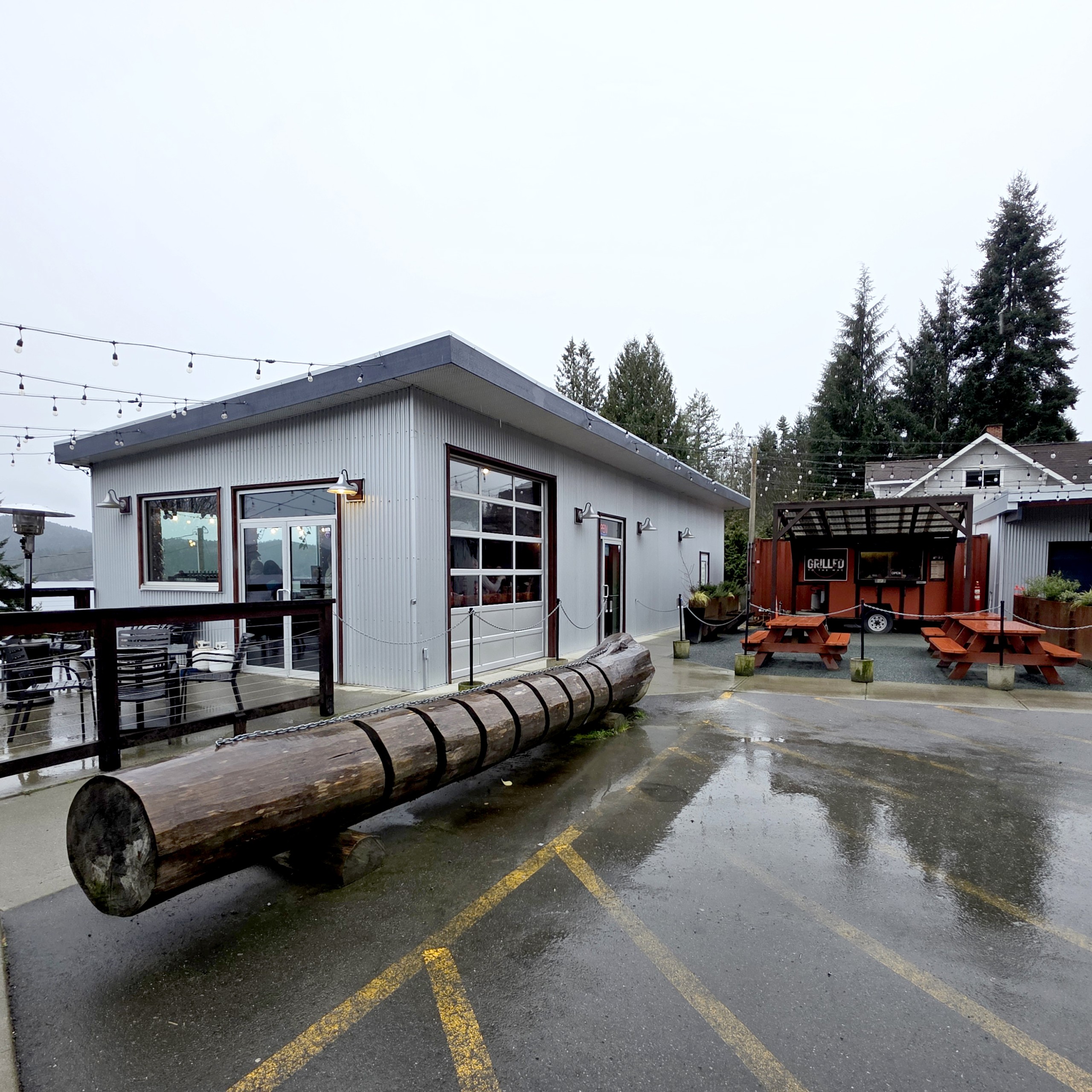 Tucked away on a rural property, the space includes the brewhouse and taproom, a picnic area, and the Hot Diggity Dog Food Trailer parked outside.