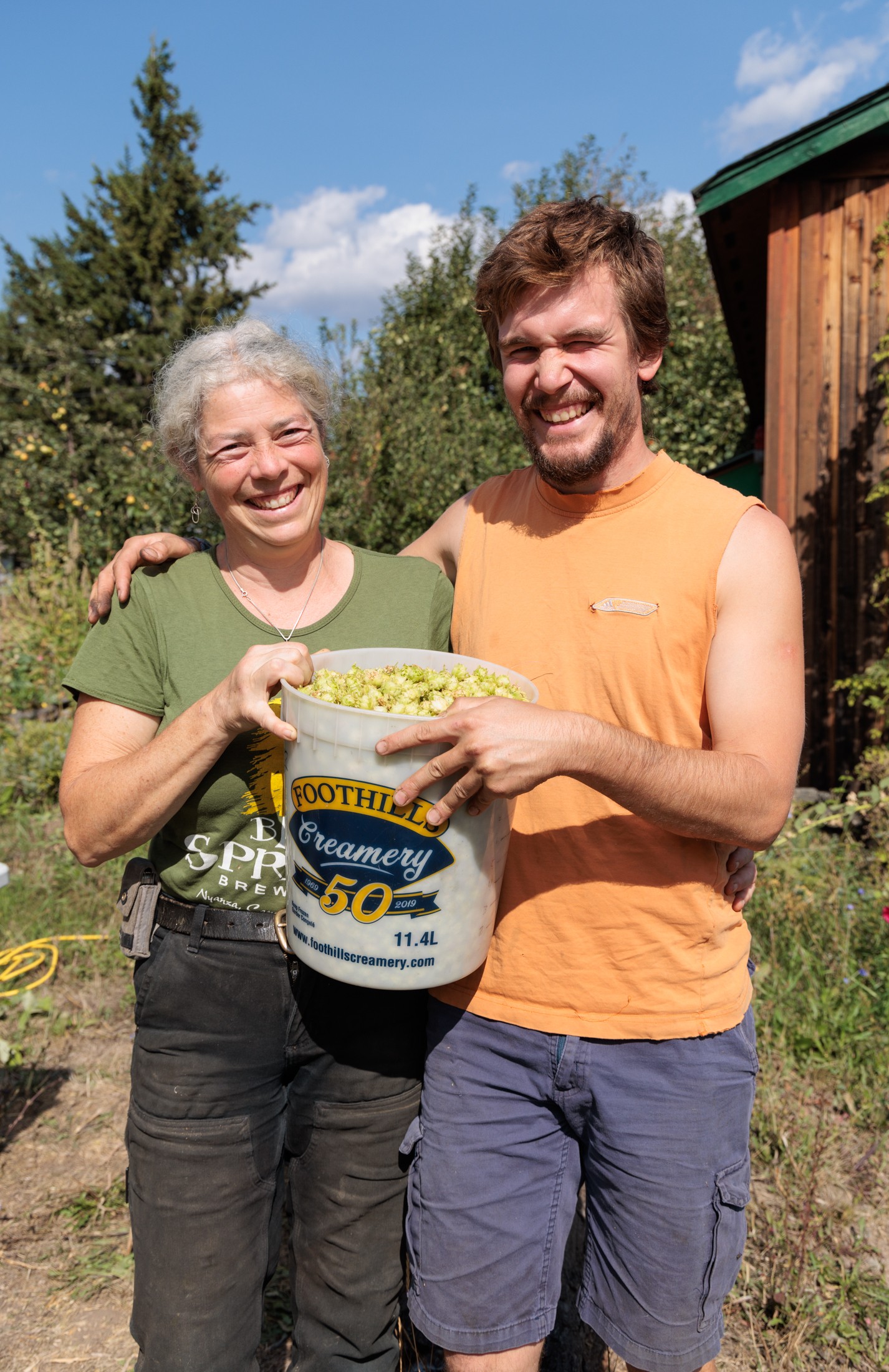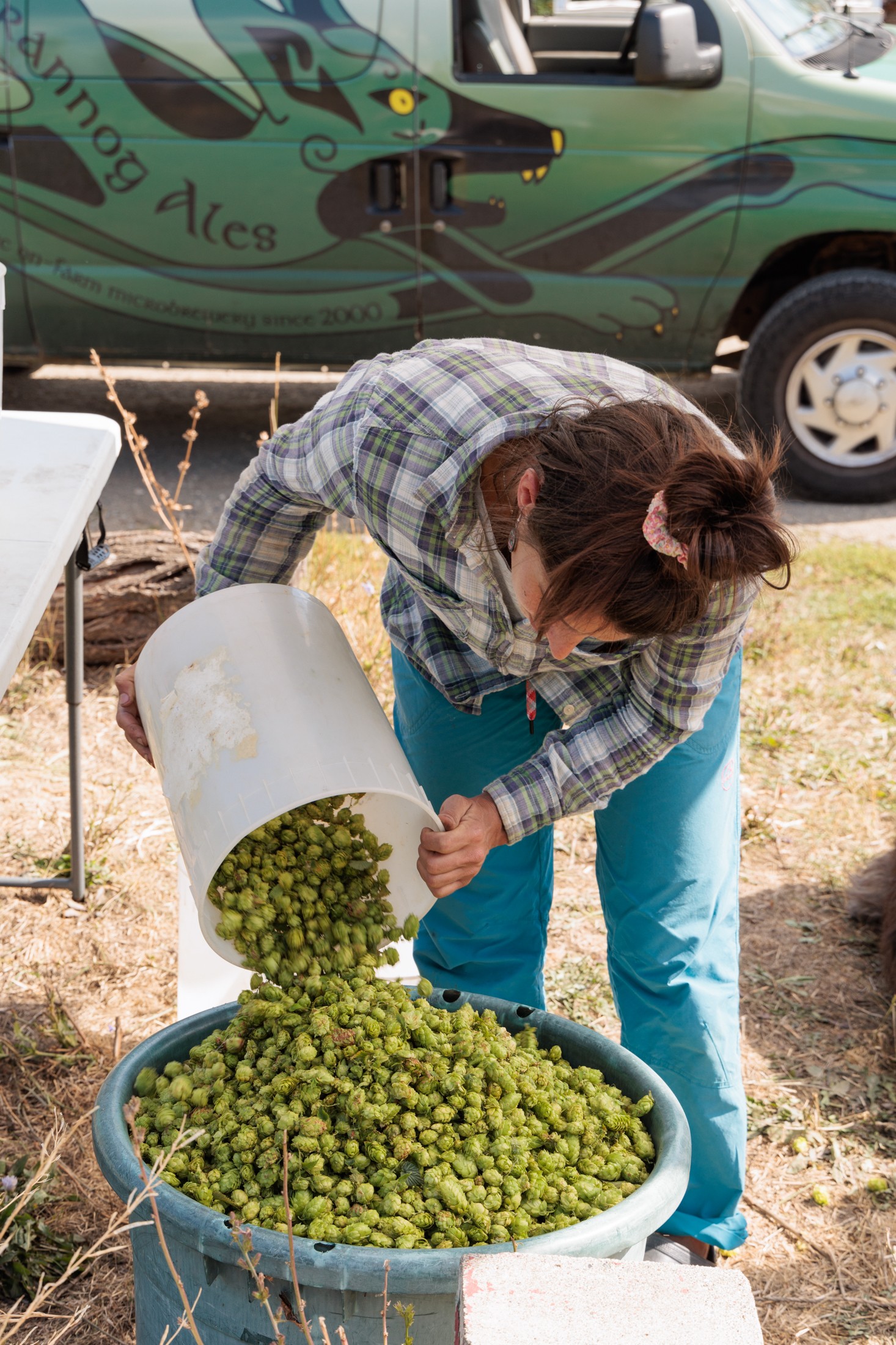 A visit to the brewery in mid-September was in stark contrast to a previous visit in April. The September visit was interrupted by the repeated thud-thud-thud-thud of Chinook helicopters carrying helibuckets of water (up to 9842 litres) to fight a fire, still raging out of sight, over top of the mountain. This emergency had started three weeks earlier. The brewery was bustling with activity as it was the height of hop harvesting. Many local craft beer enthusiasts and neighbours were busy lending a helping hand at this critical time of the year. I was able to get Rebecca Kneen (the farmer) and Brian MacIsaac (the Brewer) away from the hustle for a short interview.