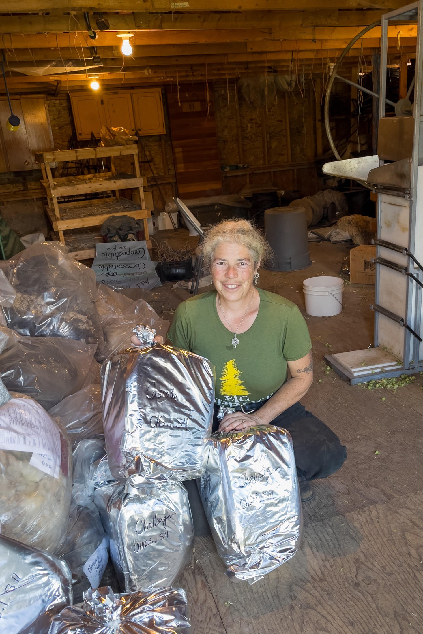 Rebecca then pulled out trays of dried hopes and packed them into sacks using a baler. This “powered by might” manual press could certainly replace going to the gym during harvest time.