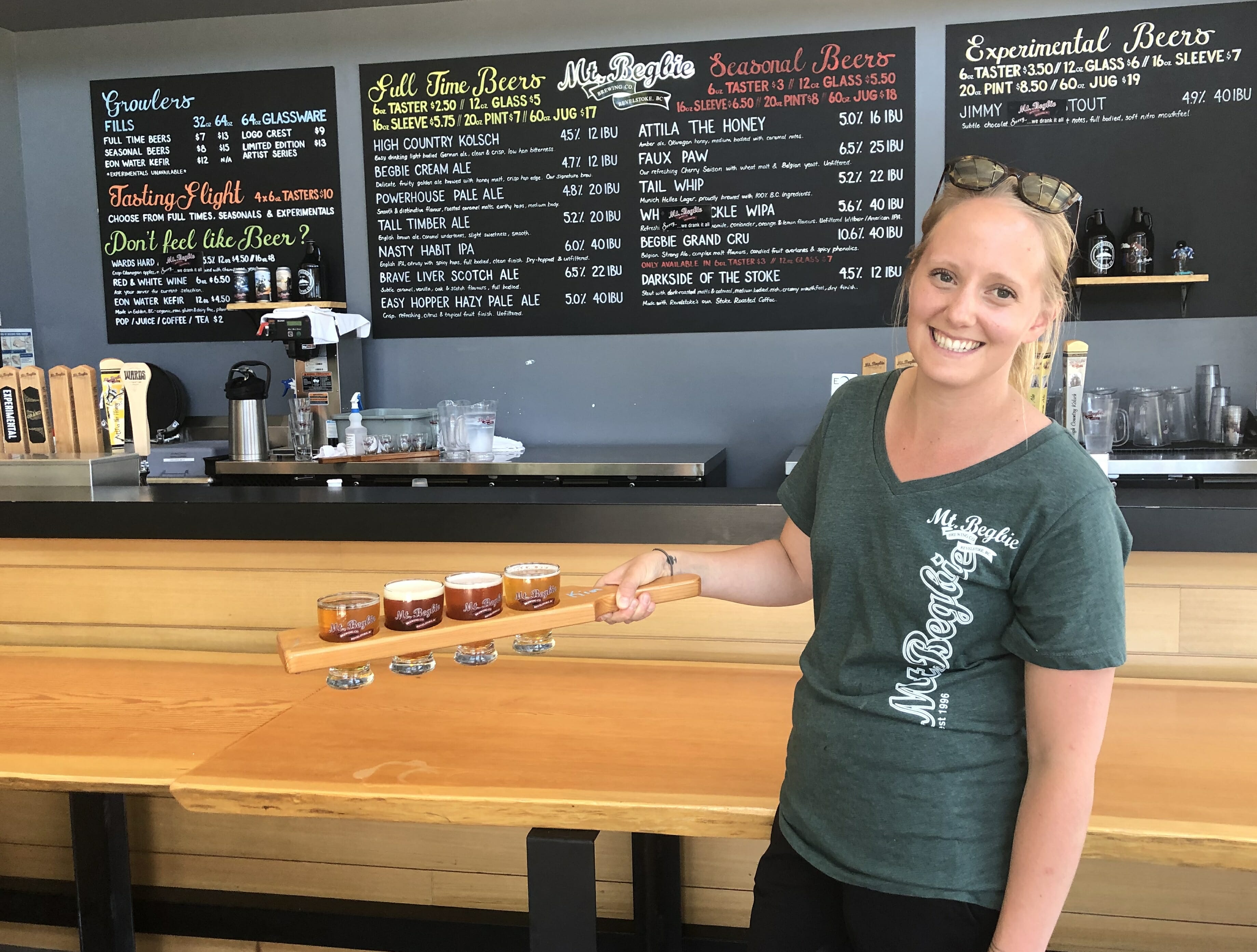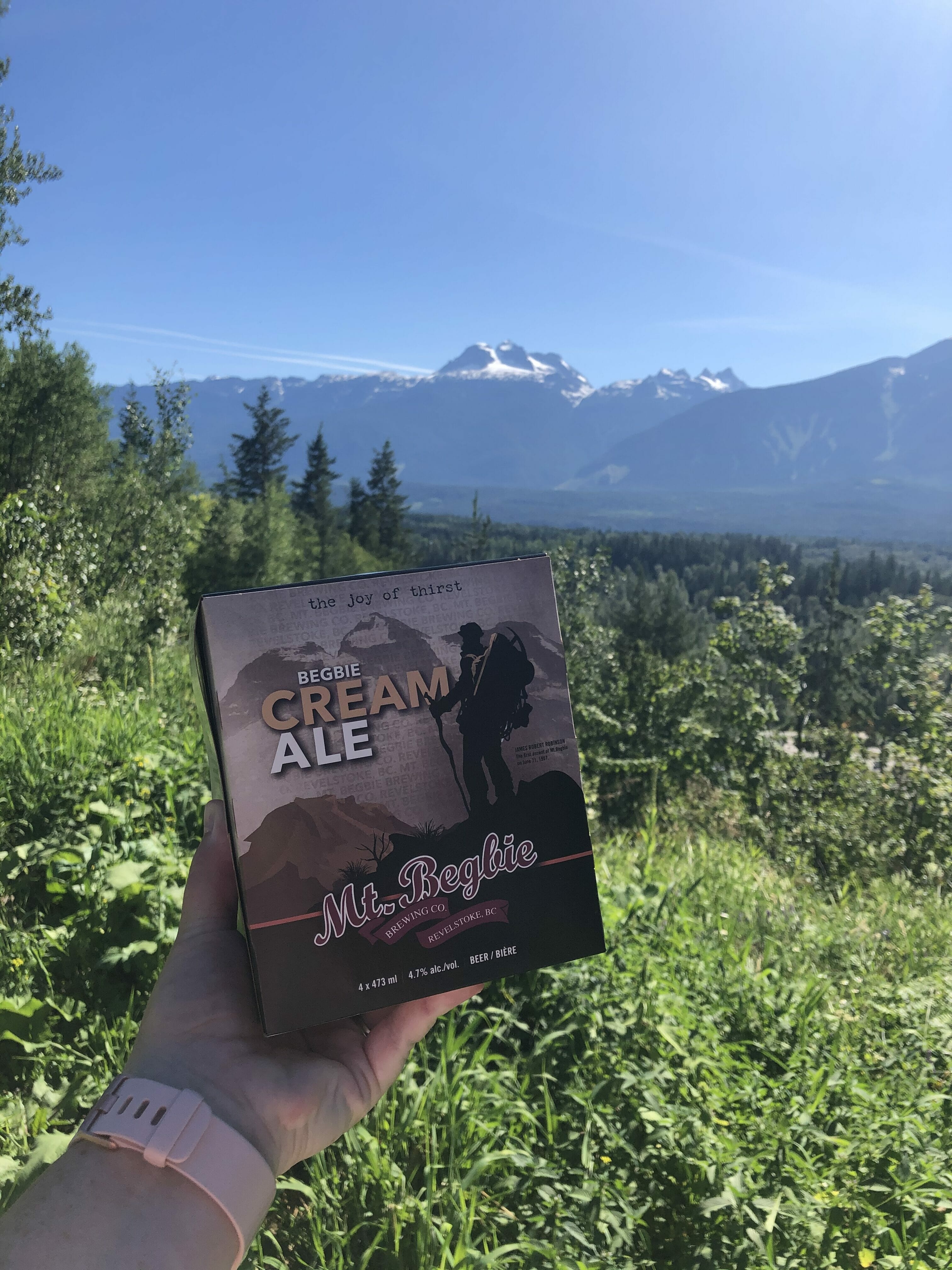 While enjoying a flight of beers on the sun-drenched patio, Darryn showed us their new dog-friendly grassy area. Darryn also pointed out their namesake Mount Begbie, Revelstoke’s most identifiable mountain peak. This mountain is also featured on their newly rebranded Begbie Cream Ale, now available in four-pack boxes of 473ml tall cans.