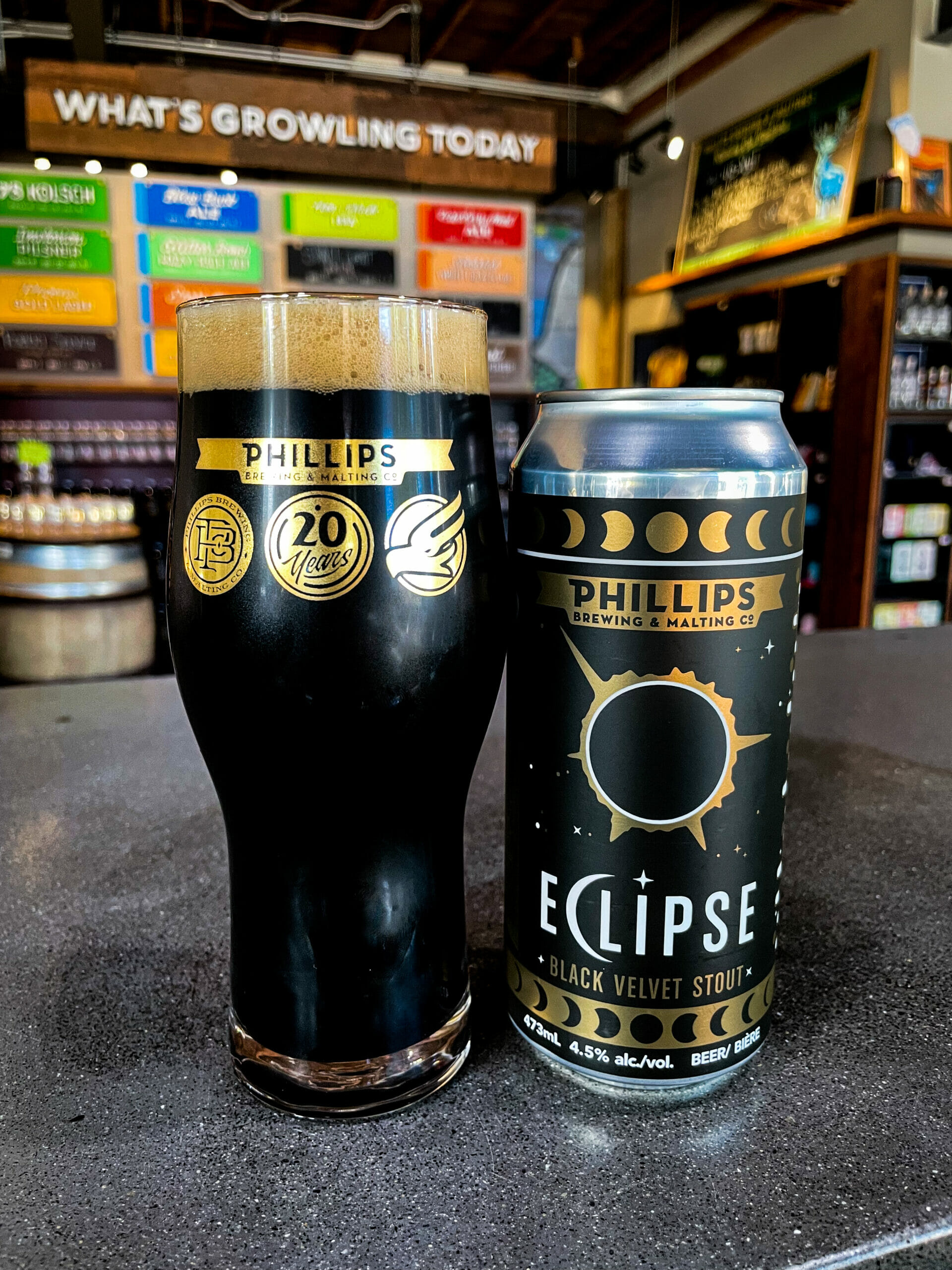 - Eclipse Black Velvet Stout (4.5% ABV) This dark roasty stout delivers a pleasant coffee aroma and a silky, bittersweet chocolate malt-forward profile that is deep and complex but sits light and dry on the palate.