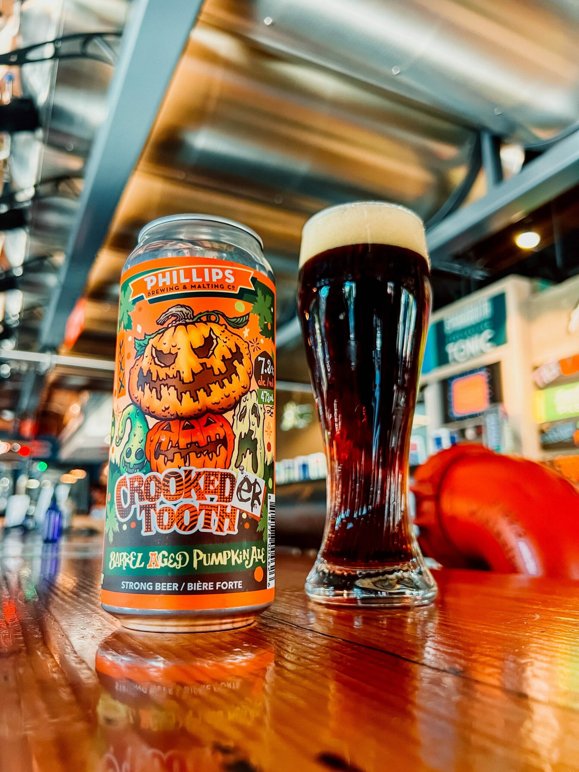 - Crooked’er Tooth (7.3% ABV) This pumpkin ale is brewed with beautifully roasted malt and then carefully aged in freshly-emptied bourbon barrels for a slightly sweet, gently spiced brew that blends fresh pumpkin flavours with soft velvet vanilla.