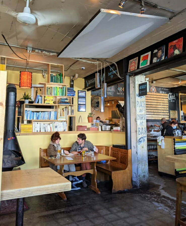 There’s synergy but not always symmetry: light fixtures don’t necessarily match, much of the signage is hand-written, and the vibe is undeniably East Van. There’s nothing that could be described as cookie-cutter, and for an 800-square foot space, it really rewards exploration. Sit at a wooden table and peruse the packed bookshelf behind you during one visit; come back on the weekend for a cask ale and watch a soccer game on a giant pull-down screen, or grab a window seat on a long padded booth to listen to a local DJ.