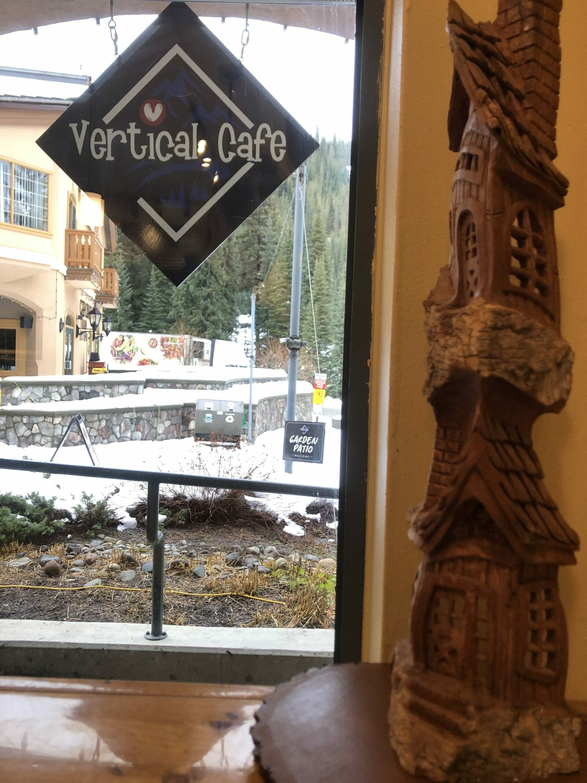 Over a falafel and frosty can of Altitude Adjustment, I find local artist John McKnight’s fairy tale-like wood carvings. John has carved tiny homes into a thick tree branch that make it look like an elves’ home. From my stool, I watch the hum of ski life pass by the window: kids ski into the village and regulars grab their coffees in their clunky ski boots.