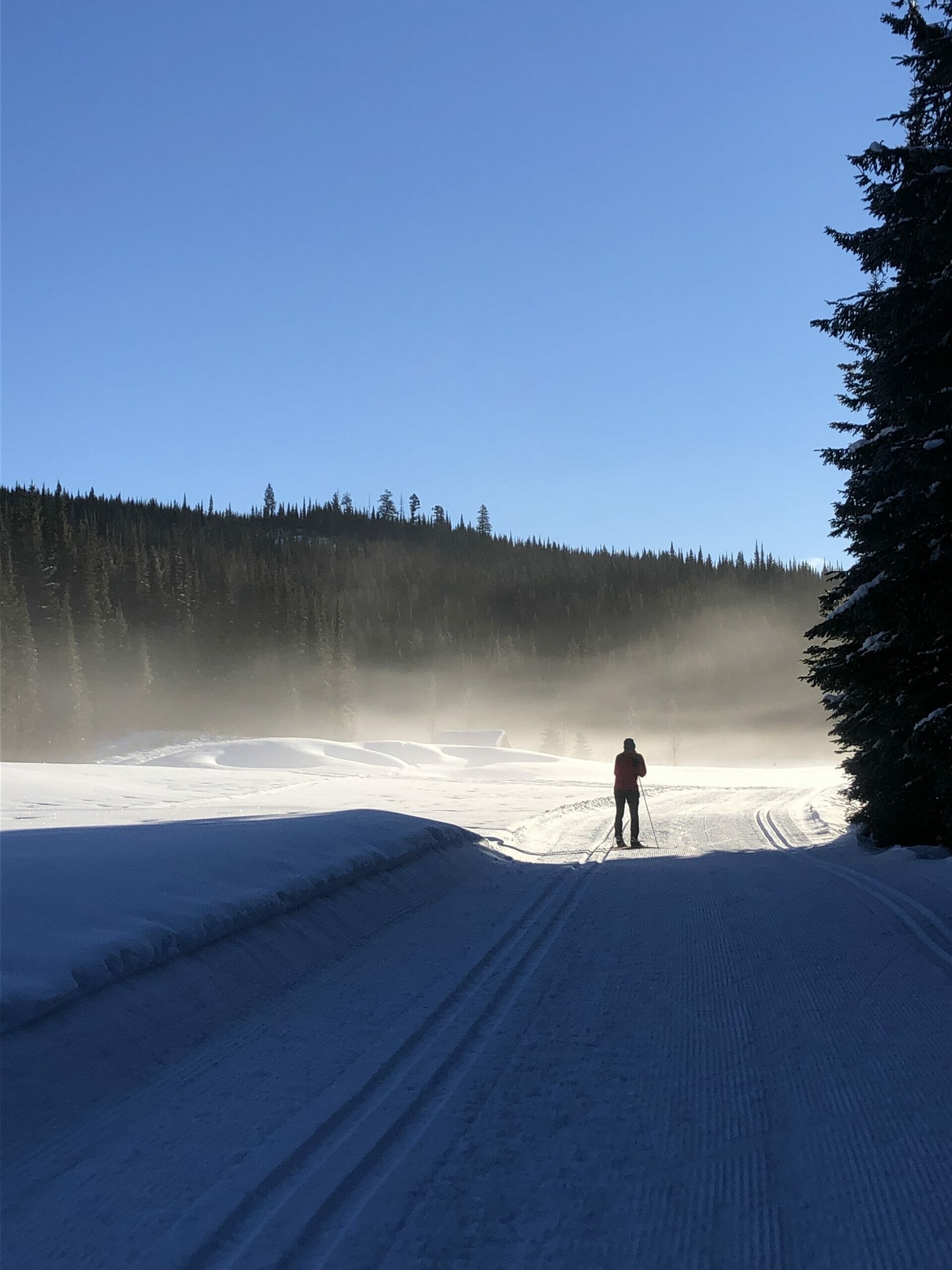 And, for the more experienced, you can take the Morrisey Express chairlift to the top—it’s the only Nordic centre in Canada with a chair lift! The view from 1,675 metres above is spectacular. And the best: a stop into the McGillivray Lake hut for some hot chocolate and chit chat. Skiing back down, I run into Phil Youwe, the director of Nordic skiing. Phil gave me a skate skiing lesson back when I visited Sun Peaks in 2016.