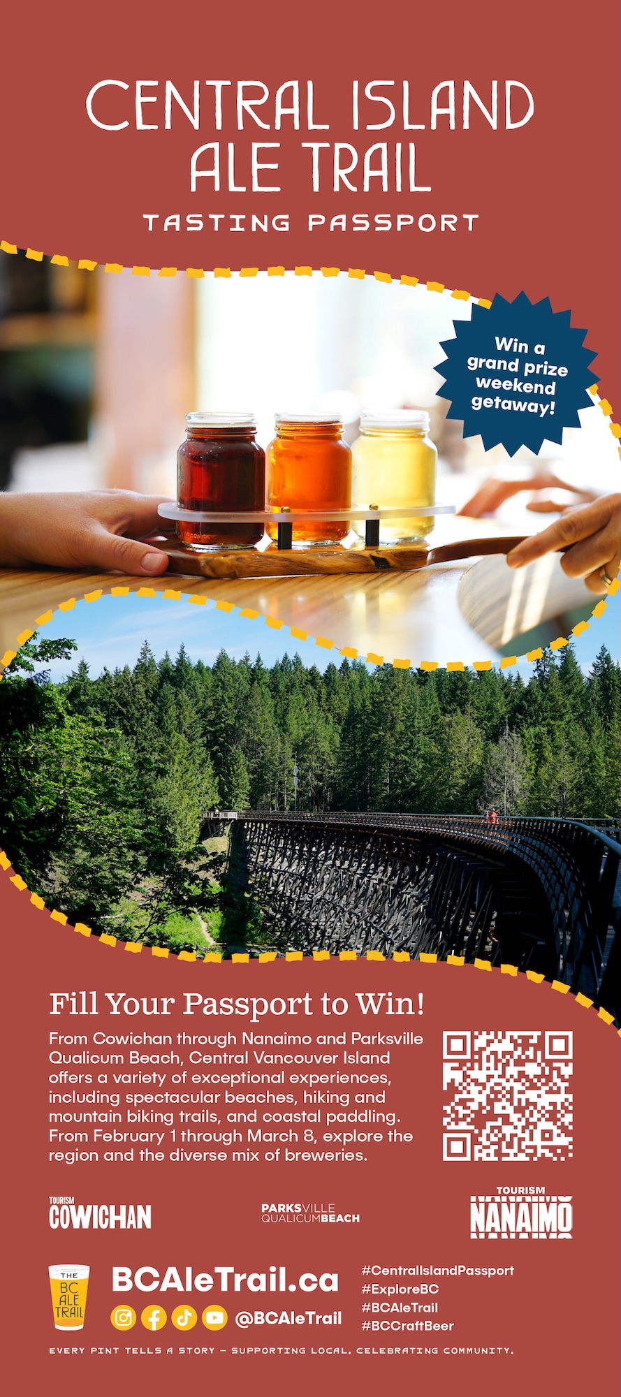 - Visit any of the participating breweries listed below from February 1 – March 8, 2026 and ask for a stamp with purchase, or scan the QR to collect a digital stamp in the BC Ale Trail mobile app.