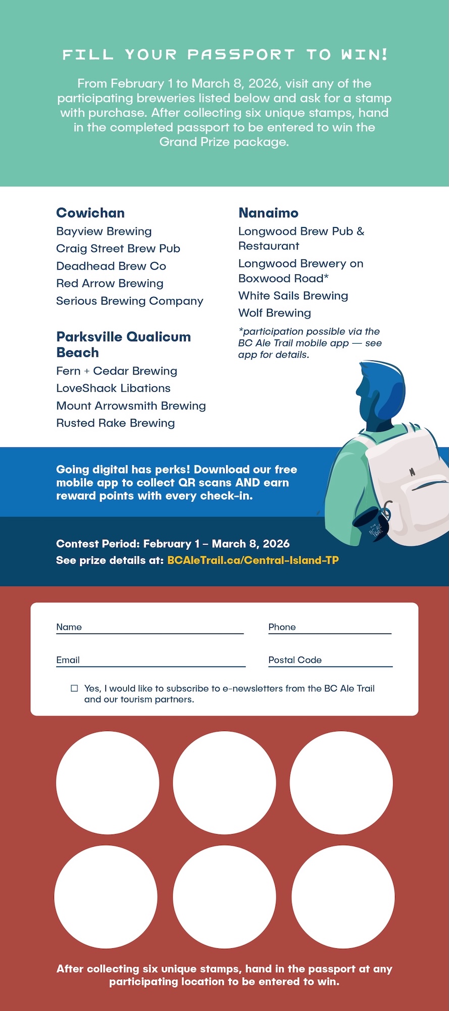 The Central Island Tasting Passport is available for free at any of the participating breweries. Prefer paperless? Download the free BC Ale Trail mobile app to collect stamps by scanning a QR code. PLUS earn reward points when you check in.