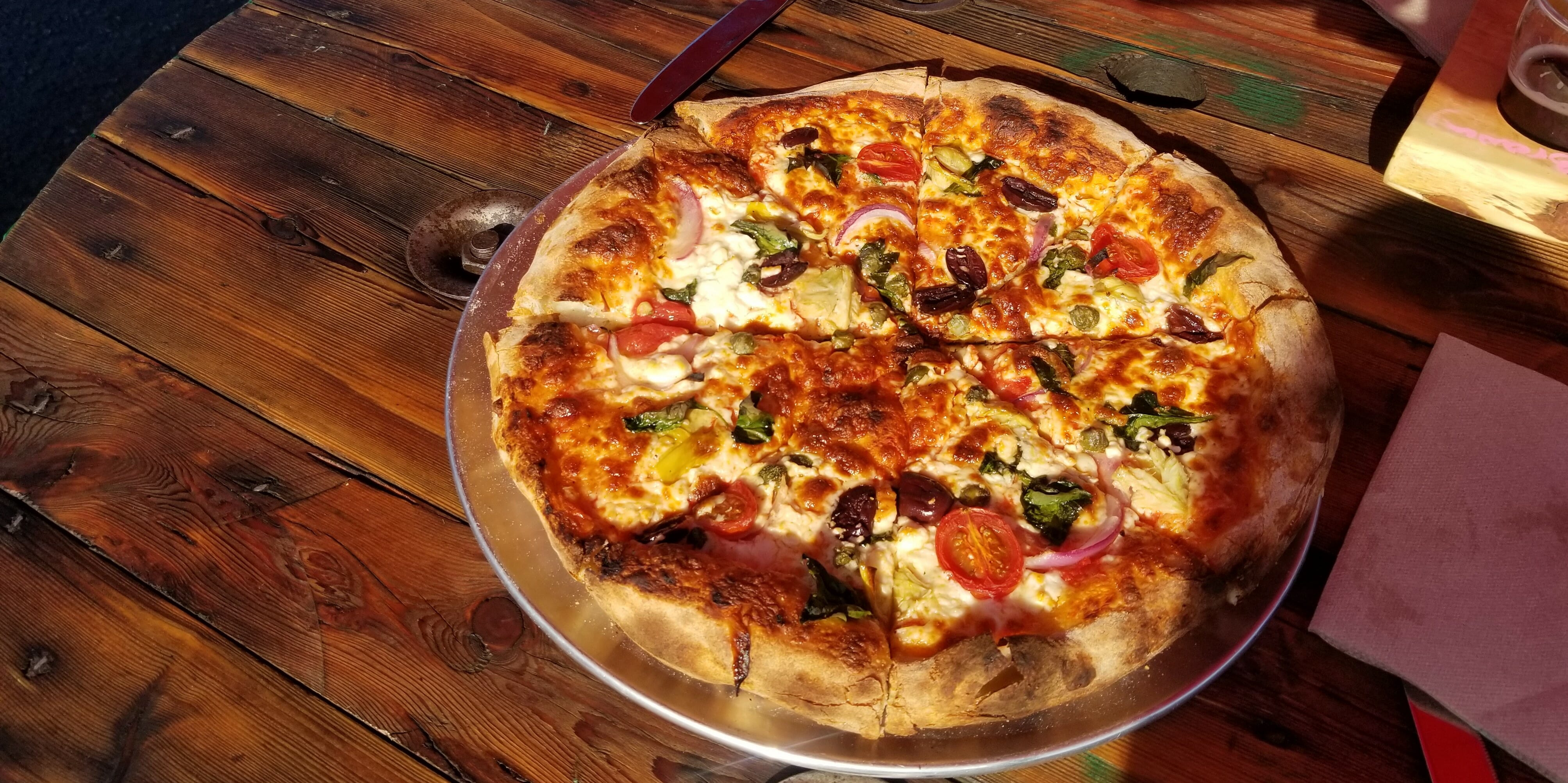 The menu includes meat and veggie tacos, salads, creatives sides, and fantastic pizza with options for everyone. They even have a kids menu.