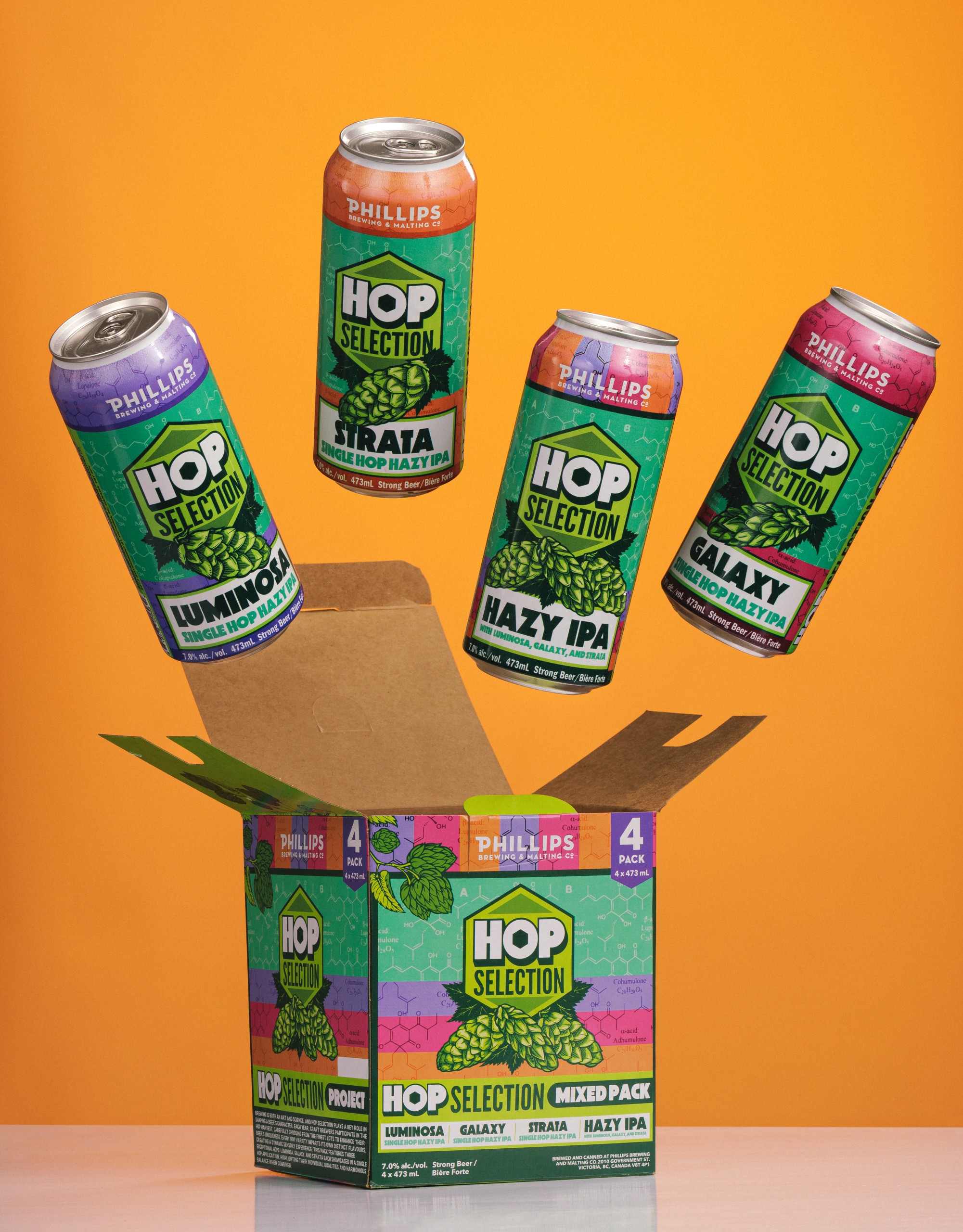 Also, look for the Hop Selection Mixed Pack currently available in the Phillips retail store and coming soon to private liquor stores across BC. It includes four hazy IPAs designed to showcase the unique character of three standout hop varieties: