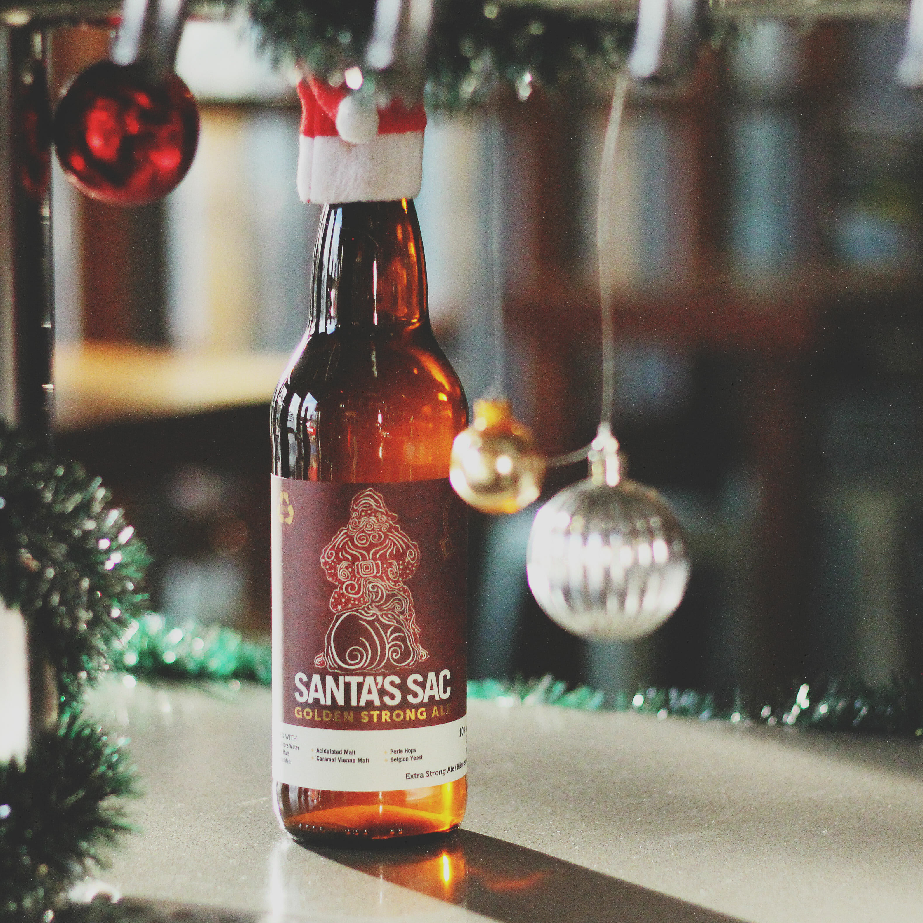 • Santa’s Sac Belgian Golden Strong (10.5% ABV |30 IBU) This Belgian Golden Strong-style ale was fermented with Trappist Ale yeast, resulting in notes of clove, banana, and peppercorn.