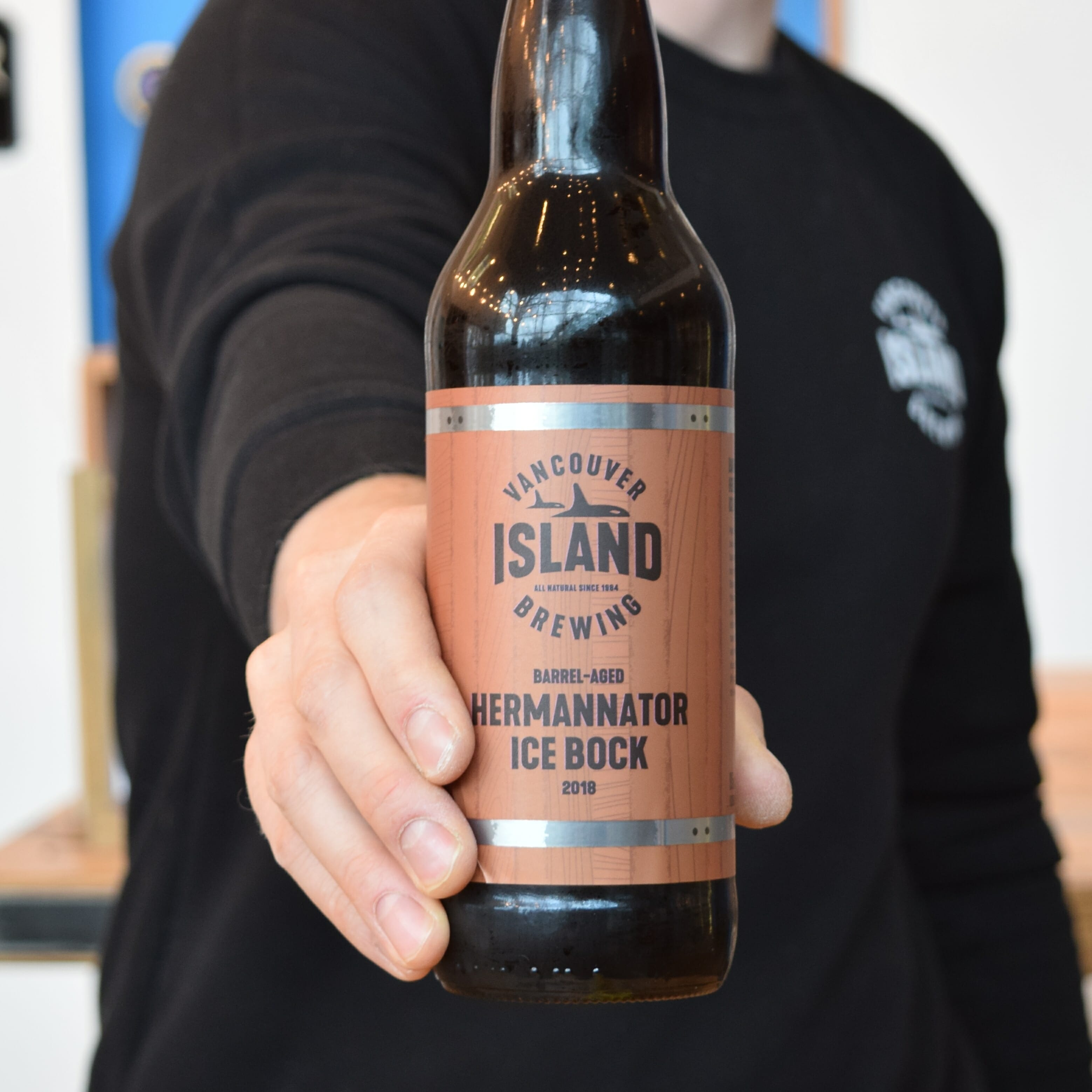 An ode to the Chardonnay grape, this beer is dry and crisp with flavours of pineapple, tart apples, and pear. Perfect for New Year’s Eve. - Barrel-Aged Hermannator Ice Bock – 2018 Vintage! (9.5% ABV | 25 IBU)
