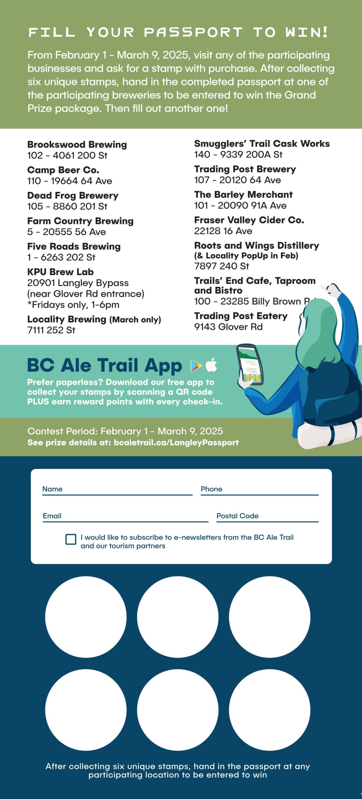The Langley Ale Trail Tasting Passport is available for free at any of the participating businesses. Prefer paperless? Download the free BC Ale Trail mobile app to collect stamps by scanning a QR code. PLUS earn reward points when you check-in.