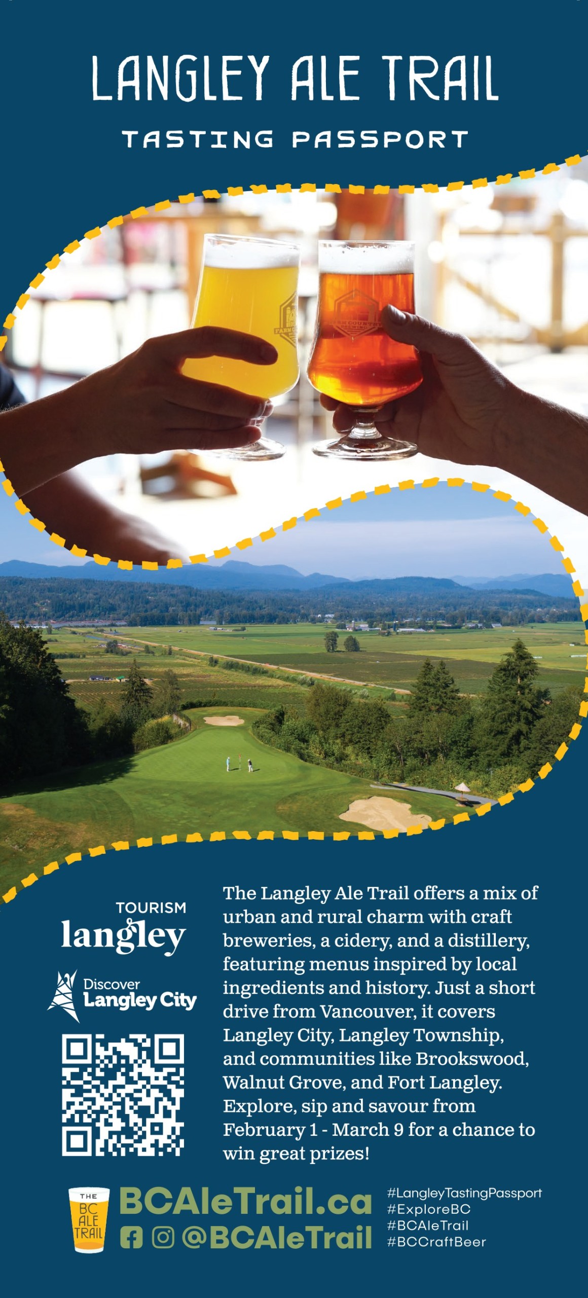 The Langley Ale Trail offers a mix of urban and rural charm with craft breweries, a cidery, and a distillery, featuring menus inspired by local ingredients and history. Just a short drive from Vancouver, it covers Langley City, Langley Township, and communities like Brookswood, Walnut Grove, and Fort Langley. Explore, sip, and savour from May 1 – 31 for a chance to win great prizes!