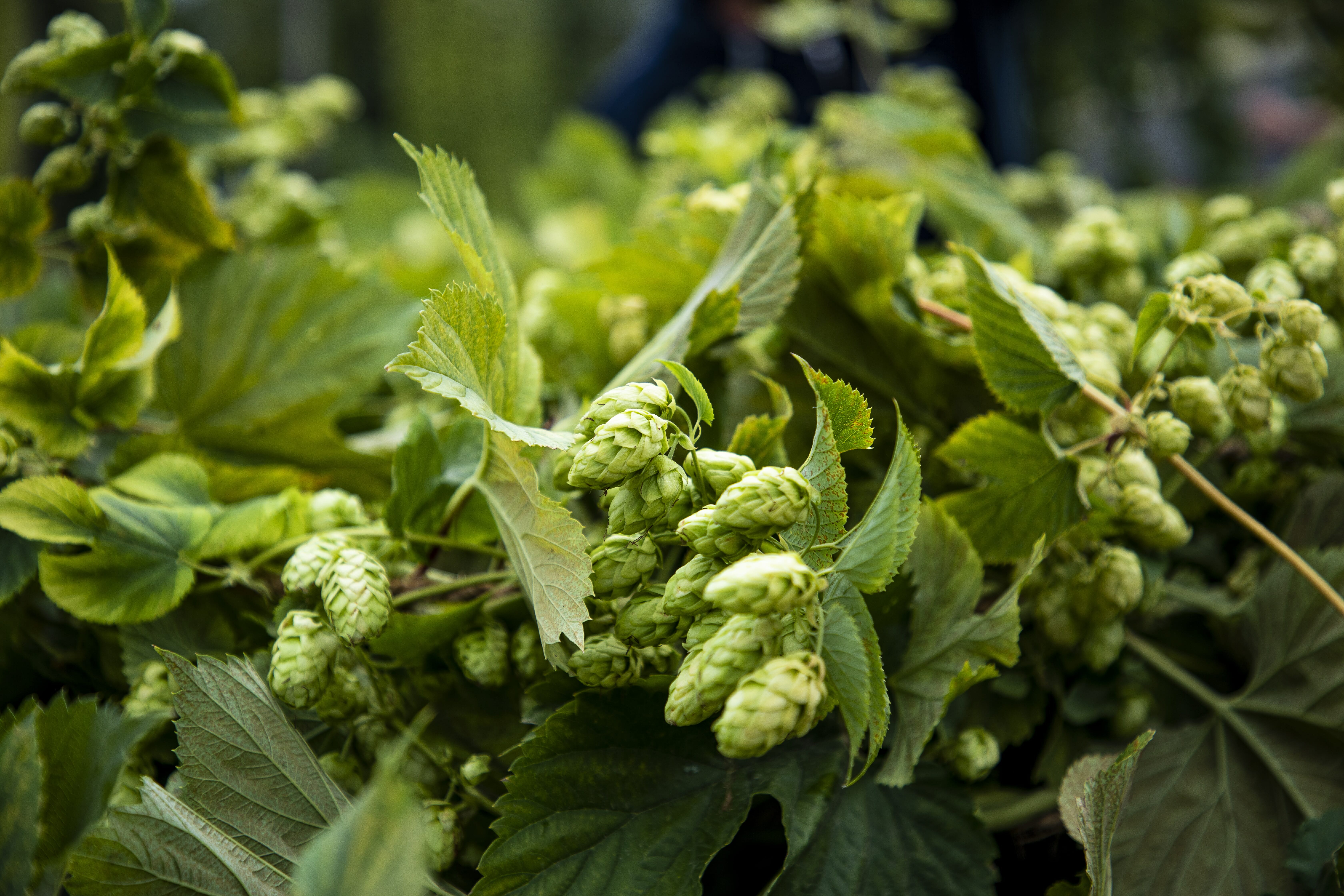Outside the brewery barn and near the soon-to-be food truck location, there are rows of bright green hop bines.