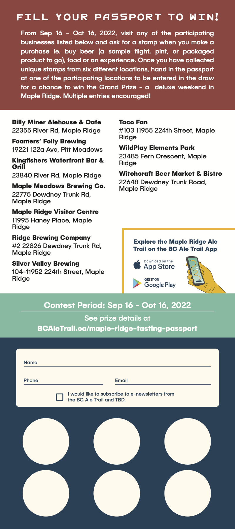 - Once you have collected unique stamps from six different locations, hand in the passport at one of the participating businesses to be entered in the draw for a chance to win the Grand Prize package.