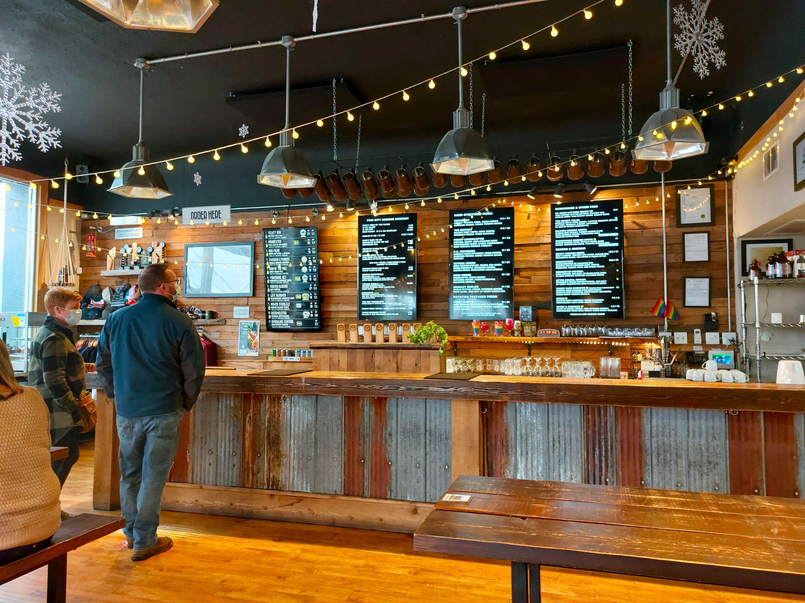 The brewery itself lives up to the town’s forestry roots. A couple (off duty) loggers enjoyed a pint in their high-vis and faller pants. An old Bloedel Lumber sign adorned the wall, alongside the brewery’s logo which features two axes.