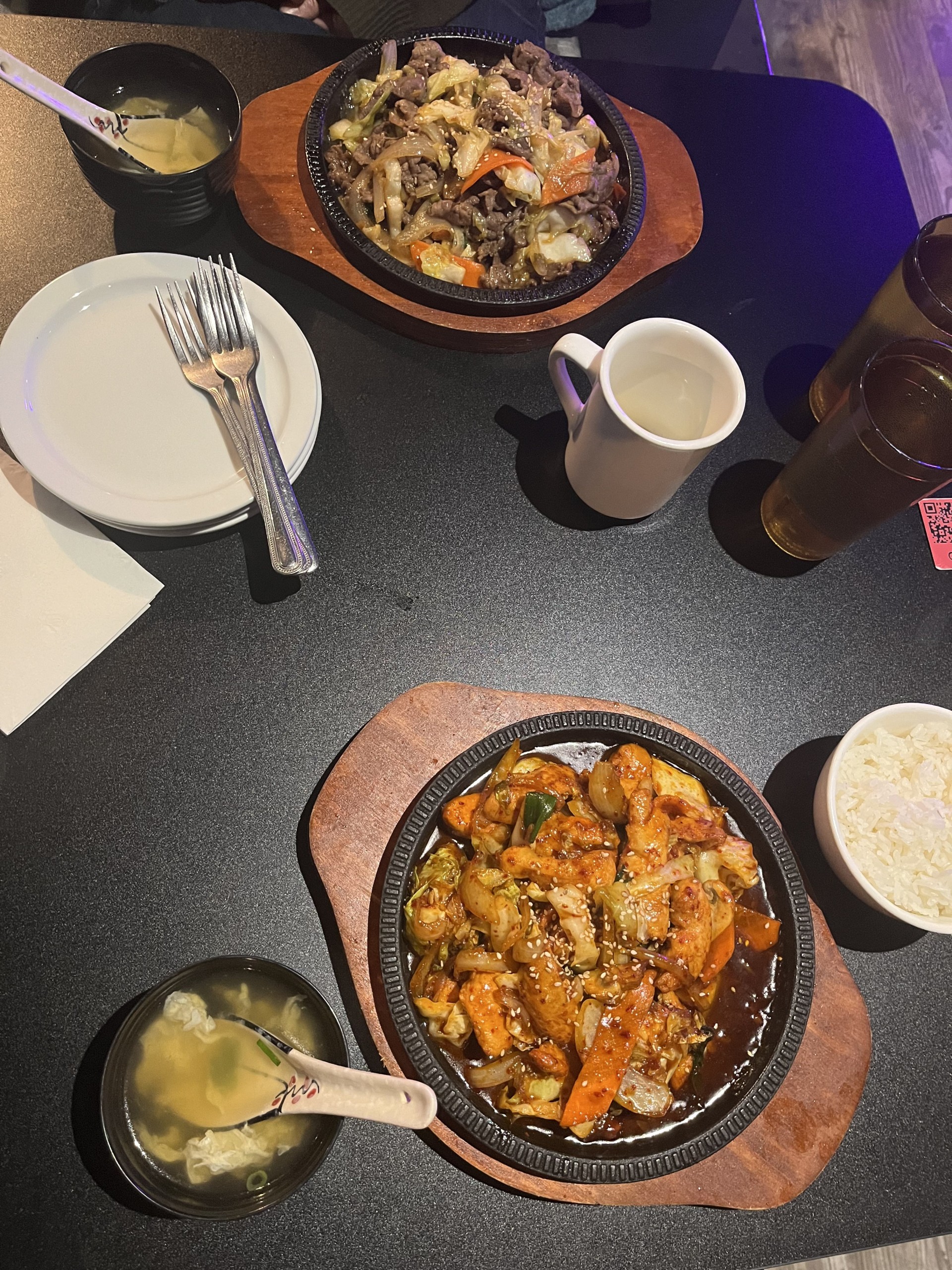 And of course, you can get local beer, but I opt for a Gangnam Cosmopolitan made from soju (Korean alcohol, typically sweet and clear). My sister contemplates the Shaft Shot. Unbeknownst to us, it’s the signature B.C. cocktail of vodka, Kahlúa, Bailey’s and coffee. It’s more dessert than drink.