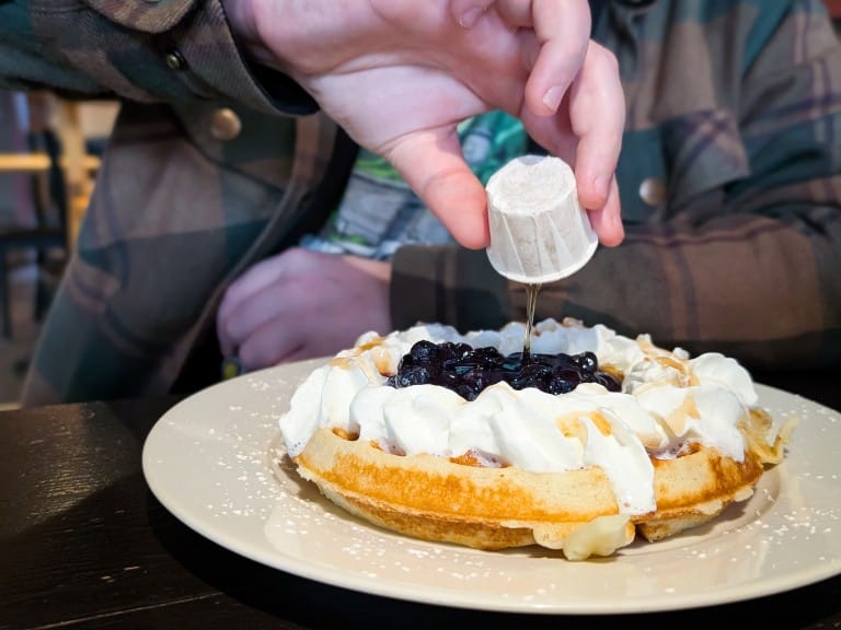 I ordered the egg and cheese breakfast sandwich built on one of their freshly baked biscuits. While the sandwich was great, I spent most of the meal low-key beaming my son’s Belgian waffle, piled high with whipped cream and blueberries. I may have been just a little jealous. So, to satisfy my sweet tooth, I decided to grab one of their warm cinnamon buns to bring along on our next adventure.