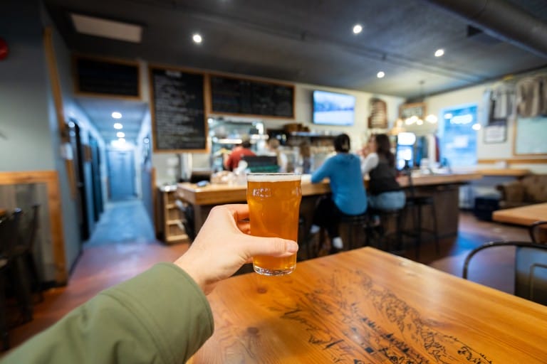 After the Visitor Centre, we checked into the Coast Fraser Inn, and after giving our feet a rest, we took the short 2-minute stroll over to Fox Mountain Brewing. We walked into a packed house overflowing with locals enjoying the cozy atmosphere and delicious BC craft beer.