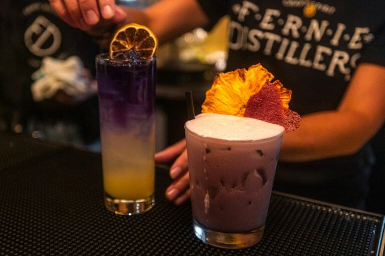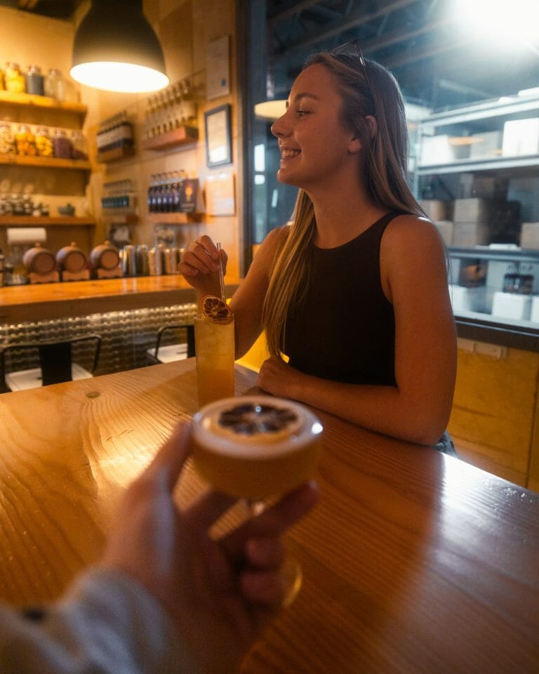 We’re told that Fernie Distillers is the place to be to end the night, and we’re excited by the hidden-gem location. When we walk in the doors, we immediately see the distillery behind a large glass window, and the rest of the interior is beautifully decorated with wood accents, giving this place a cozy, intimate vibe. We find a high-top bench seat that is close to the bar with a view of the distillery behind us.