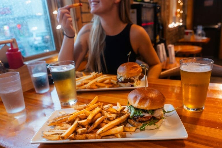 We ask our server for a local beer recommendation, and she tells us to try the “P9” or Project 9 by Fernie Brewing Company. We ordered a couple of P9s and our first dinner in Fernie — the blackened chicken sandwich with fries and a juicy burger with fries. It’s a perfect comfort meal on a rainy day after a long drive. Our beer hits the spot, and the chicken had the perfect amount of spice. The laid-back vibes of Fernie are kicking in, and we’re excited to check out more local spots.