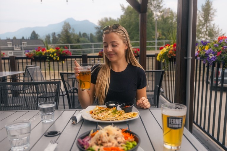 We’re feeling great after spending so much time outside today, and we head over to Fernie Brewing Company for post-adventure brews. Since we’re on the BC Ale Trail, we’re excited to finally check out what Fernie Brewing has to offer. As soon as we arrive we notice the incredible patio that’s busy with groups of friends, families and locals. This must be the place to be!