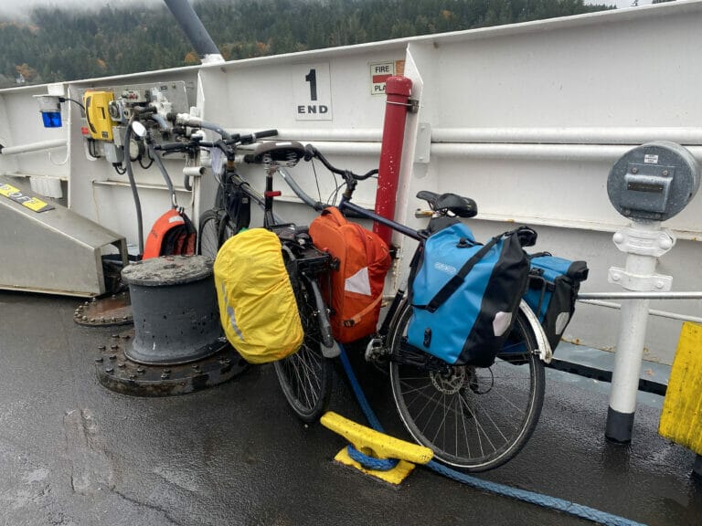 Once on the ferry we took stock of our soggy condition. Tom’s old head-to-toe rain gear from his days attending UBC in rain-soaked Vancouver had served him well. My new bike pants worked great… but (flashback to my shopping decision at MEC) my feet were absolutely soaked. Every step squelched and I’m sure I left a trail of puddles behind me as I walked around the ferry.
