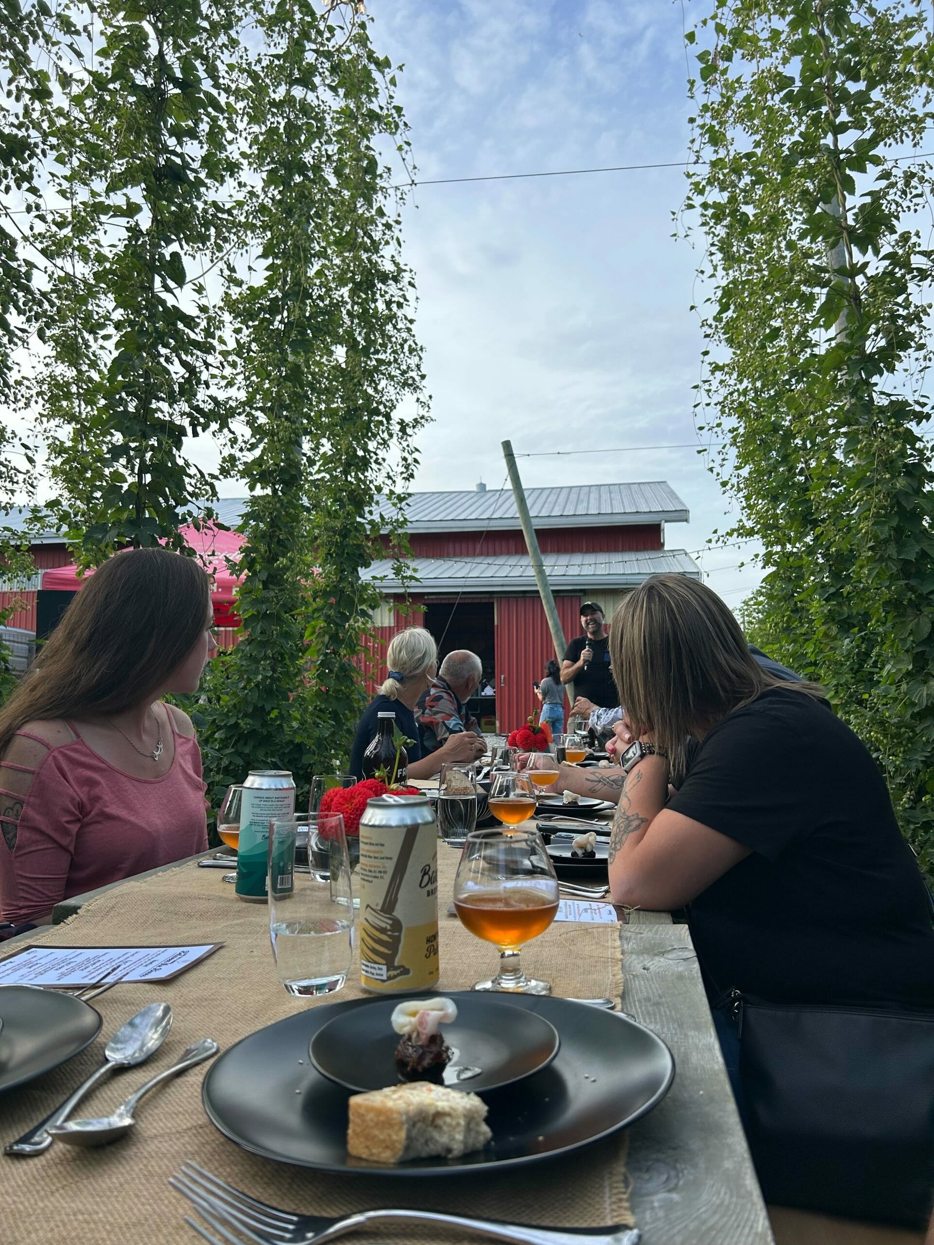 The menu included five courses, each of which was paired with a Barnside beer — beginning with their Peach Brandy Barrel Aged Sour and ending with their Estate Barley Wine. The pours were large enough to give you the full flavour with your food, but small enough that they didn’t fill you up. I was able to fully enjoy the range of tastes. Credit must be given to Barnside’s very attentive and informative staff, as well as Rebel Rebel Barbecue, who had been smoking meat since 3:30 that morning in preparation for the event. They even let us take home the leftovers! All the food was produced by local farms and food vendors, and of course all beer was very local — grown and brewed on site. There’s one more Between the Bines dinner to go, on Friday, August 18. Email Barnside to get your ticket: events@barnsidebrewing.ca!