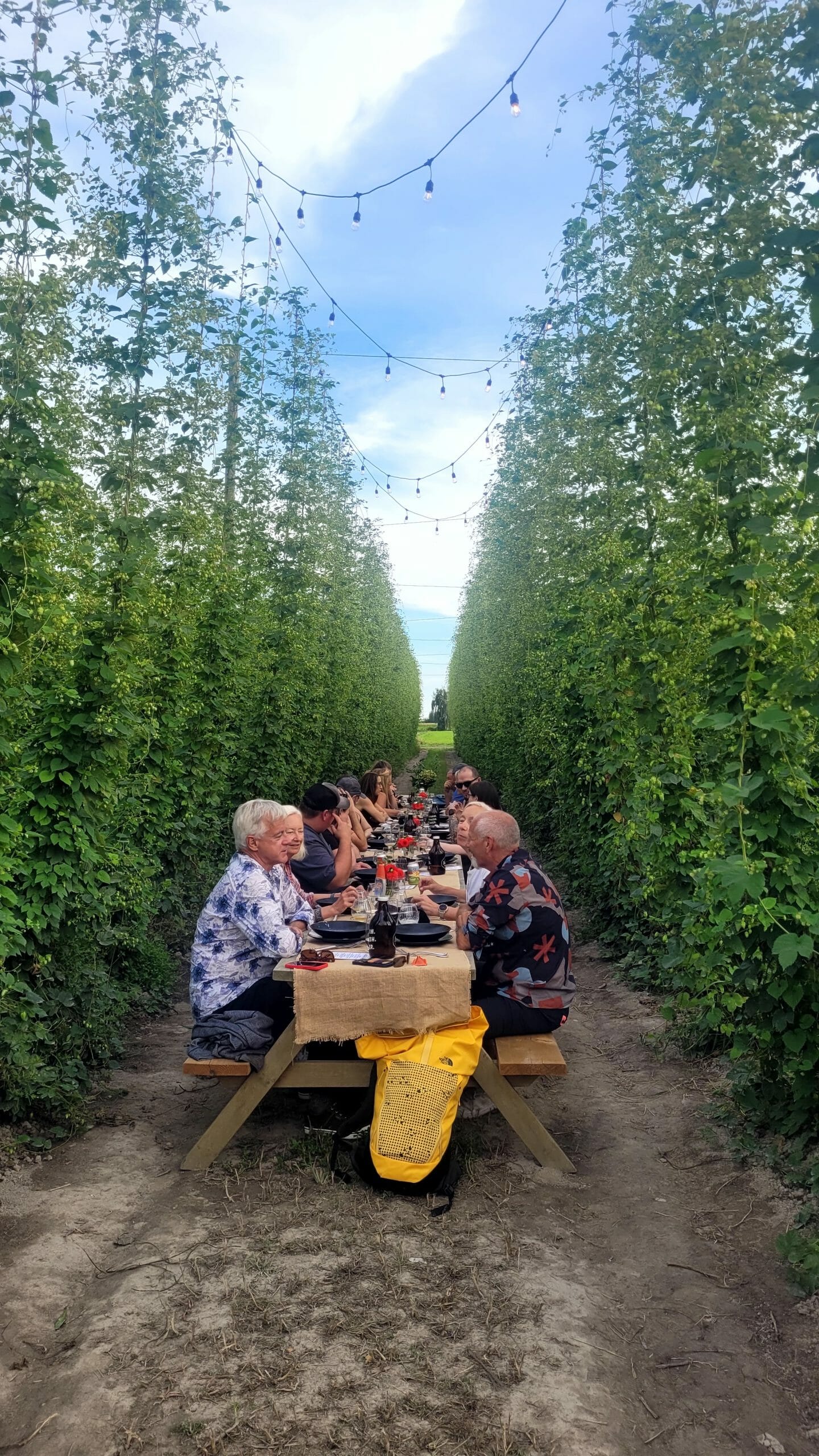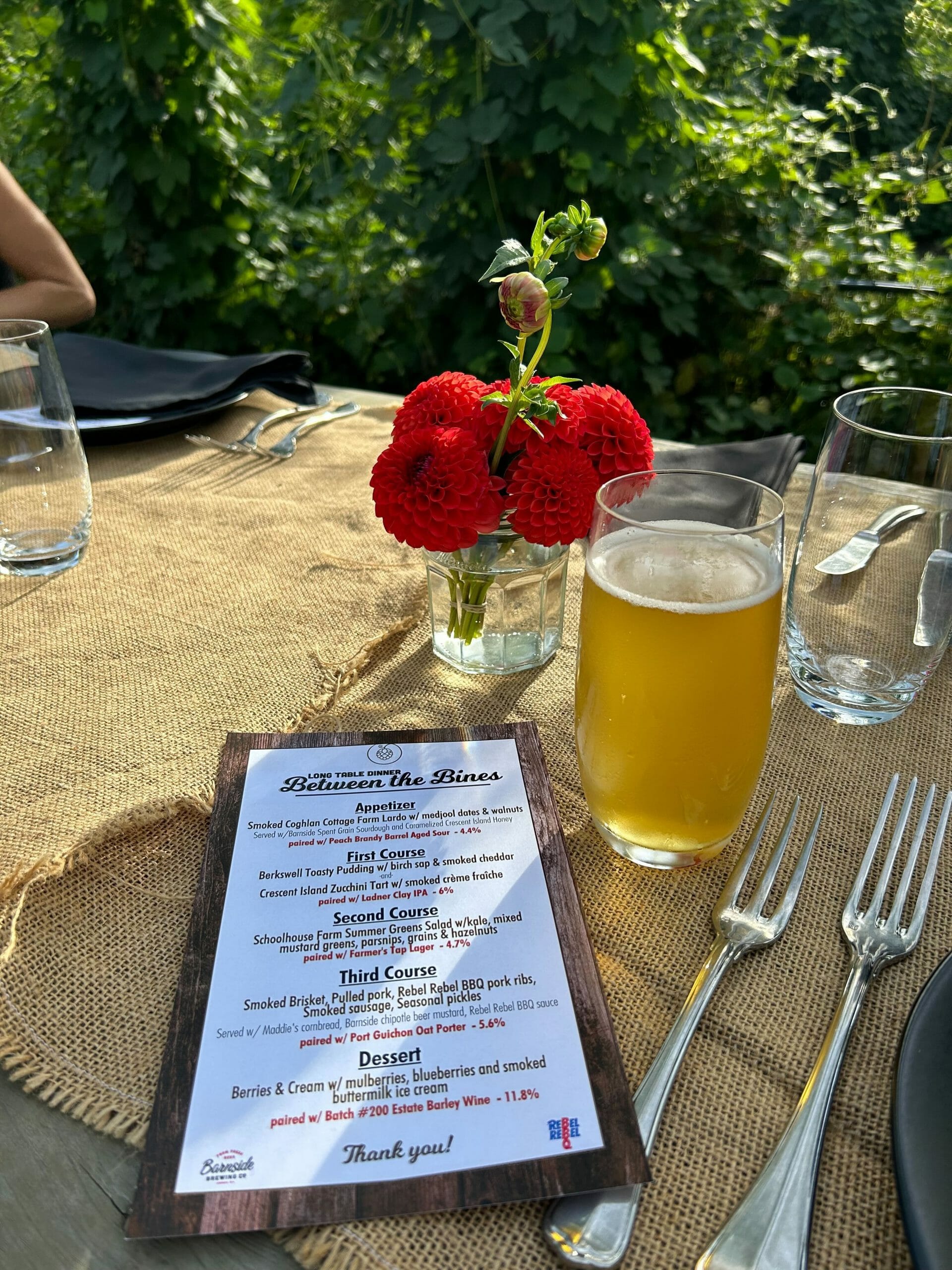 When I arrived, I was offered a choice of Barnside beers or non-alcoholic beverages (try their Roadpop Hop Water!) to enjoy while chatting on the grass alongside the hop fields. When dinner was scheduled to begin, guests were ushered to the long wooden table that had been set up between the hop bines, underneath the twinkling strands of lights criss-crossed above. It felt magical.