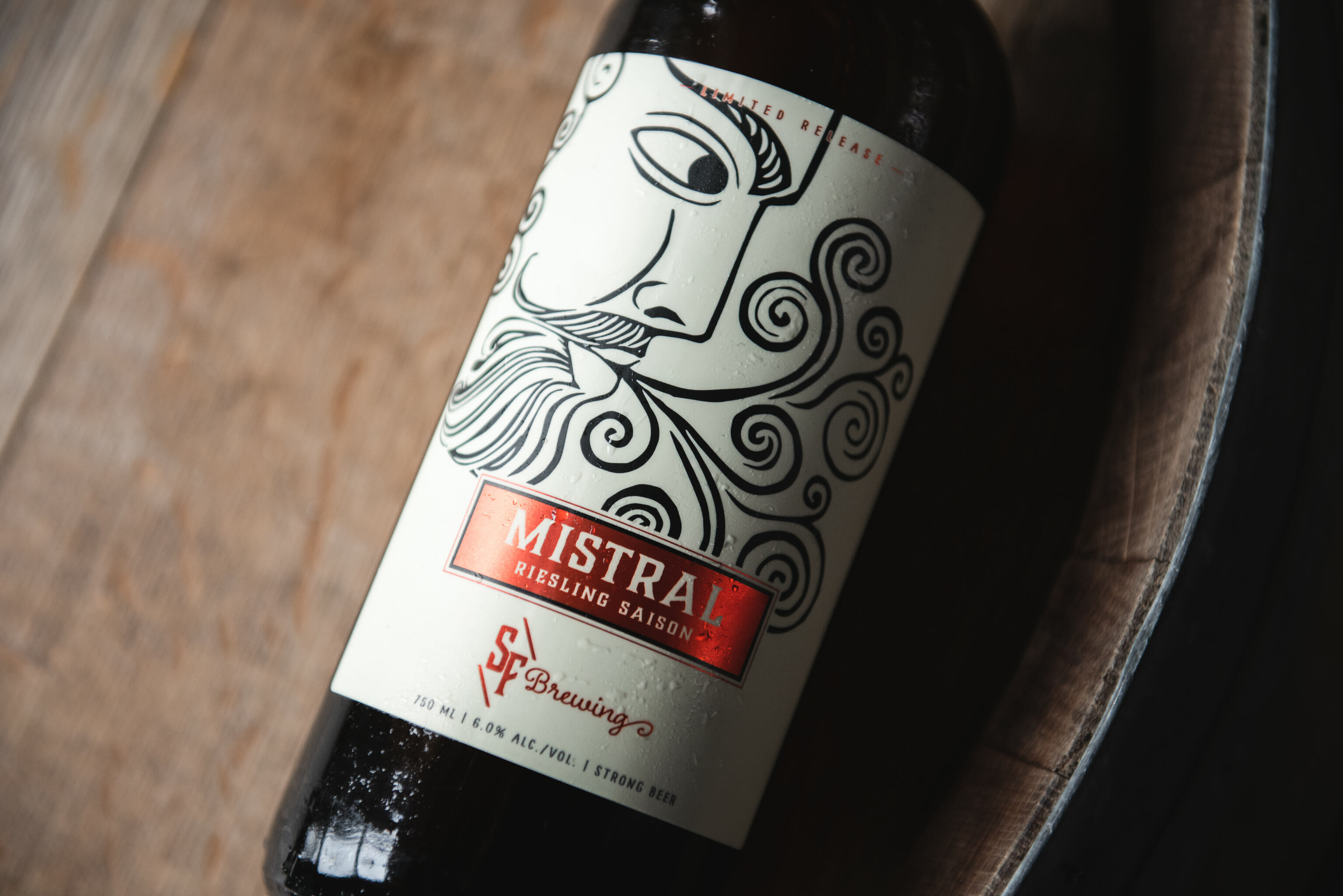 - Mistral Riesling Saison (6% ABV) This dry bright saison was aged in ex-Riesling barrels with a unique yeast culture. The result is a beer not unlike the wine with classic Riesling flavours reminiscent of lime, petrol, and dry earth.