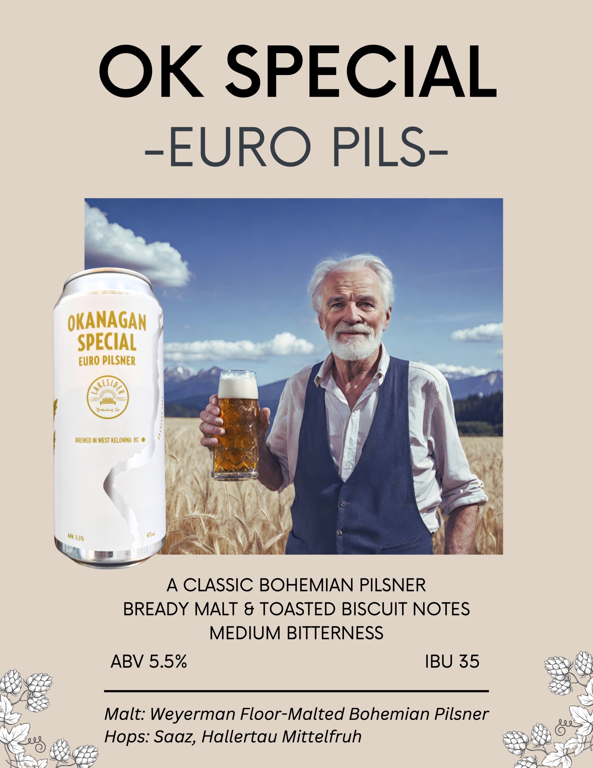 - Okanagan Special Euro Pilsner (5.5% ABV | 32 IBU) Brewed in the classic Bohemian style using only premium floor-malted Bohemian barley and choice Noble hops.