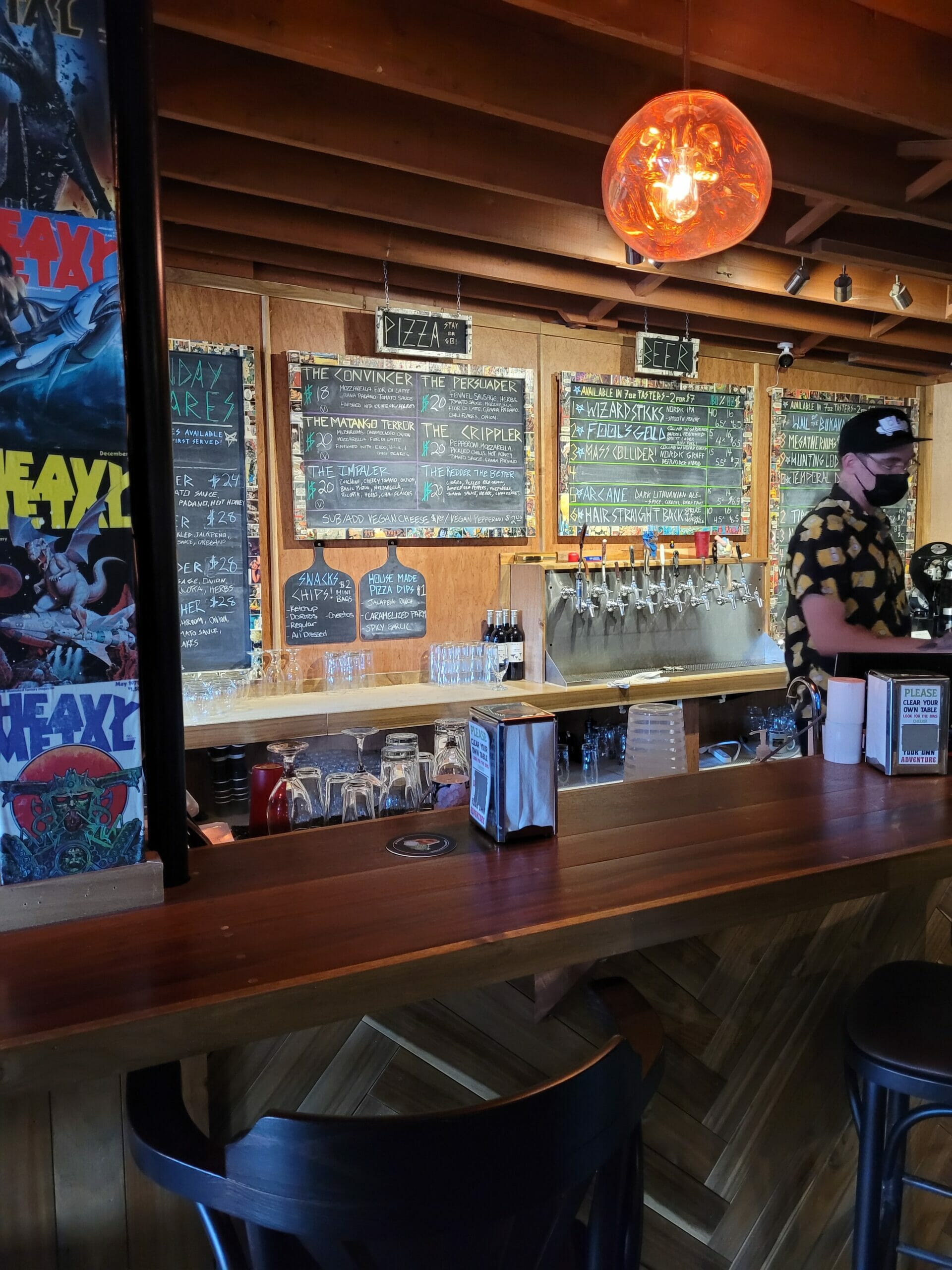 The motto on Jackknife’s wall declares that they are known for two things: weird beer and classic pizza. The beer may indeed be “weird” to some, but it’s a welcome addition for those of us looking for something new. This brewery specializes in unusual Norwegian-style beers made with kveik, a Norwegian yeast. I tried their newly released Hunting Lodge Juniper Nordic Lager, a crisp lager with a strong malty backbone and a citrusy aroma with gin-like notes. Rich ordered Arcane, a dark Lithuanian farmhouse ale that immediately captured my attention. With deep caramel notes produced through a 5-hour (!) boil and just the right level of Chinook hops, it has an intense flavour that doesn’t seem to match its modest ABV of 5.5%. While we didn’t have a chance to try their famous pizza on this visit, we did look enviously at fellow patrons who were enjoying their slices. Jackknife doesn’t skimp on the crust or the cheese!