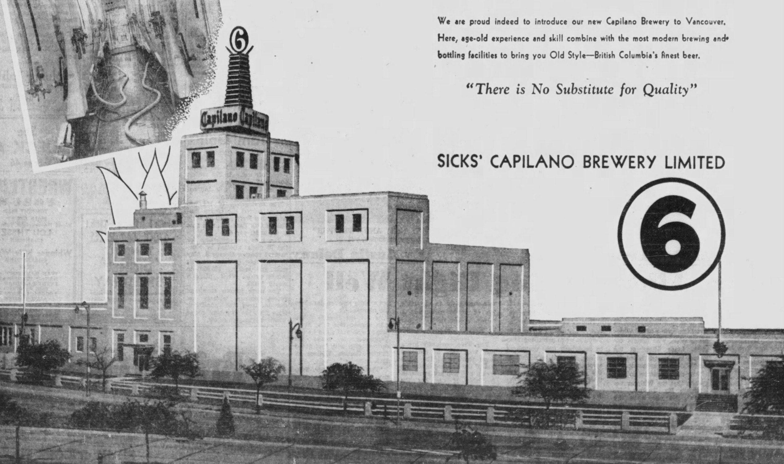 During the early 20th century, Fritz Sick and his son Emil built a brewing empire in Western Canada and Washington. In 1934, they opened their first Vancouver brewery: Capilano Brewery on Powell Street, which was enthusiastically welcomed by the community. In July of that year, The Province described the brewery, with its pristine sanitation practices, as “spic and span” and “a fine example of a modern brewery.” Automation was a point of pride: “the beer is piped from great cellars into the automatic bottling and labelling machines… [T]he bottle-washing machine… washes thousands of bottles perfectly without the use of human hands in a single operation.”