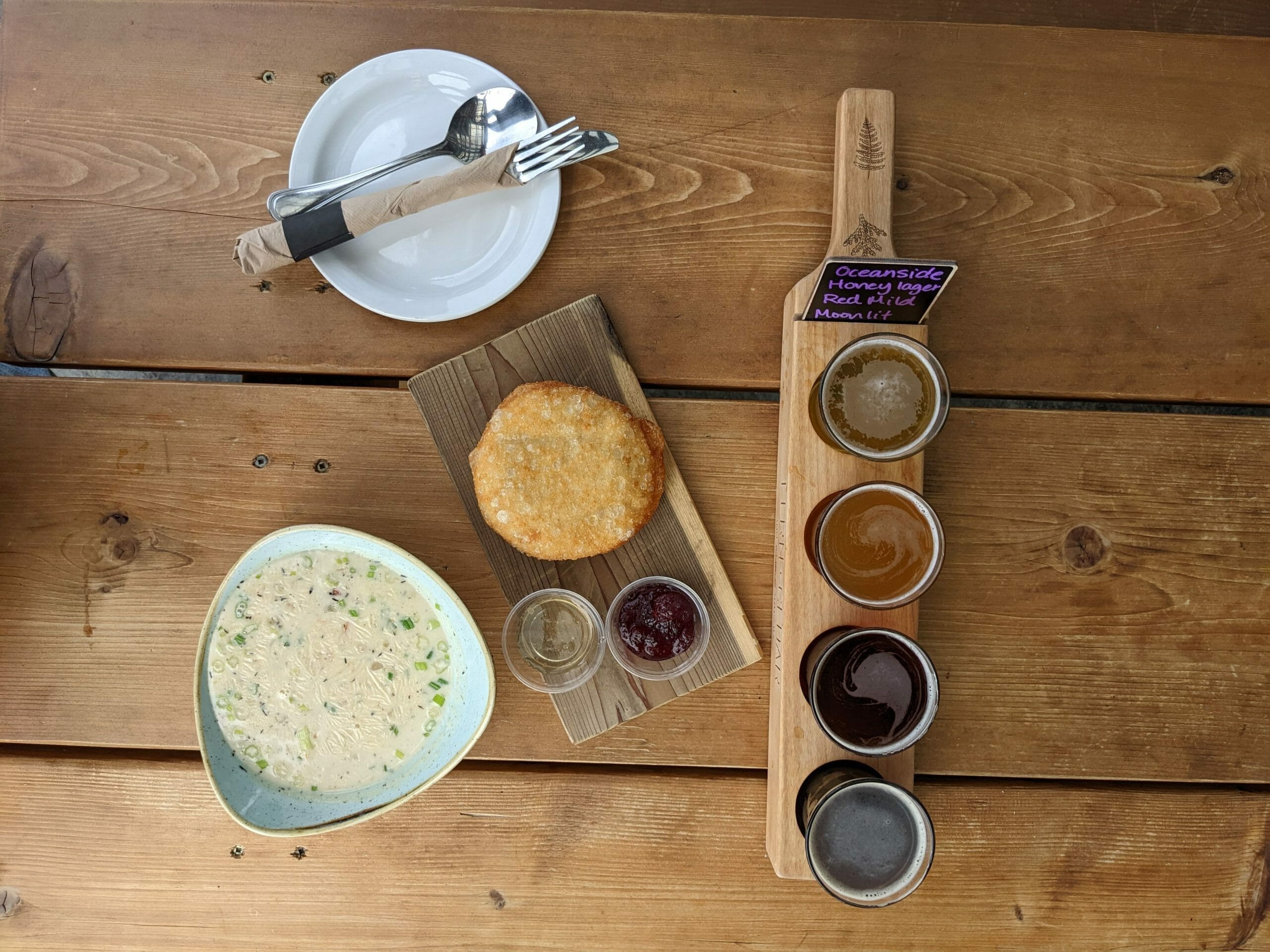 Despite only being in business for less than a year, this big, bright, purpose-built brewery has already established itself as a must-visit destination on the mid-Island. Fern + Cedar brewer Wes Bain is creating consistently crushable brews with their core line-up including a gently hopped lager, a crisp West coast pale ale, a dark ale, and a New England style IPA. However, the restaurant at Fern & Cedar is worth the visit alone. Head chef Michael Sproul has created an inventive, family-friendly, west-coast leaning menu that includes extremely popular items like the fried chicken sandwich, a huge cod & chips, and a decadent BBQ lamb shoulder. But tucked away in the sides & salads part of the menu are two hidden gems utilizing some amazing local ingredients. The Clam, Crab, and Smoked Salmon Chowder is full of seafood sourced coast to coast with local smoked salmon, clams, and crab from Nova Scotia. Inspired by the local Indigenous community, the Bannock dish is incredible. Light and crispy deep-fried Bannock served alongside a cedar jelly and maple-cranberry preserve. The cedar is picked literally outside the doors of the brewery and the cranberries are from various BC producers.