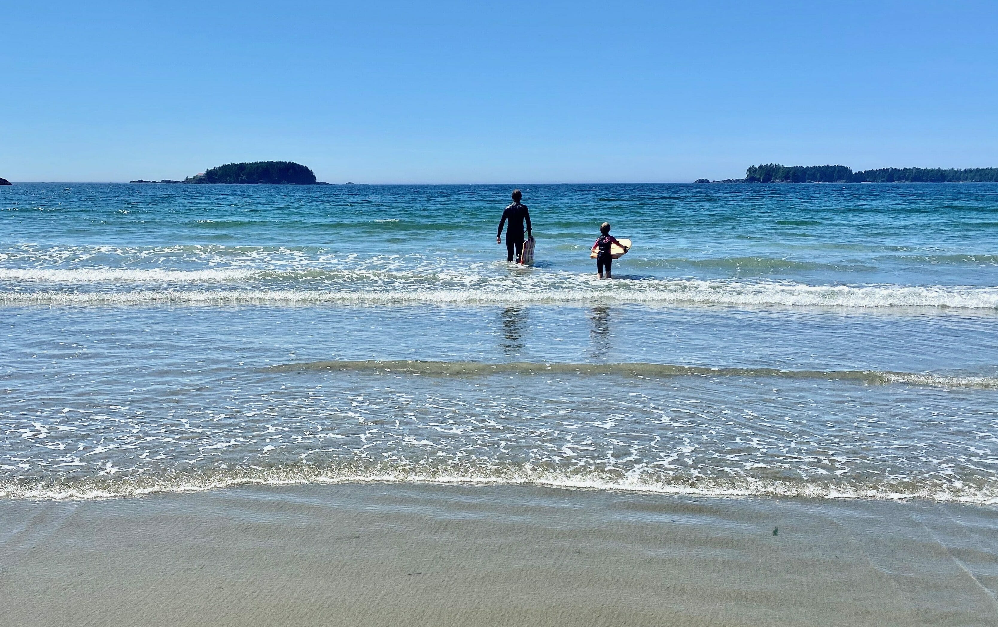 Getting a single sunny day on the west coast of Vancouver Island feels lucky, so when we stepped out of our cabin the next day under clear blue skies we knew that we were obliged to make the most of the day. Not wanting to waste a moment, we stopped by longstanding Tofino surf shop Live to Surf to rent a pair of boogie boards for the day. Officially, we justified renting boogie boards and not surfboards with our uncertainty over how our six-year-old would handle it, but inwardly we felt no regret about taking the easy way out. And we still didn’t feel any, a few minutes later, as we gleefully raced face-down through the whitewash splashing Wickanninnish Beach. Being an adult riding a boogie board, we reasoned, is more dignified than being an adult catapulting off a rented surfboard. Not much later, I was able to put this conjecture to the test when my old friend Casey arrived and offered to let me try out his longboard. Not one to pass up a challenge, I fought my way out into the waves and rode in, haphazardly, getting to my feet at least once. No, I don’t have photographic evidence, but I promise I am telling the truth.