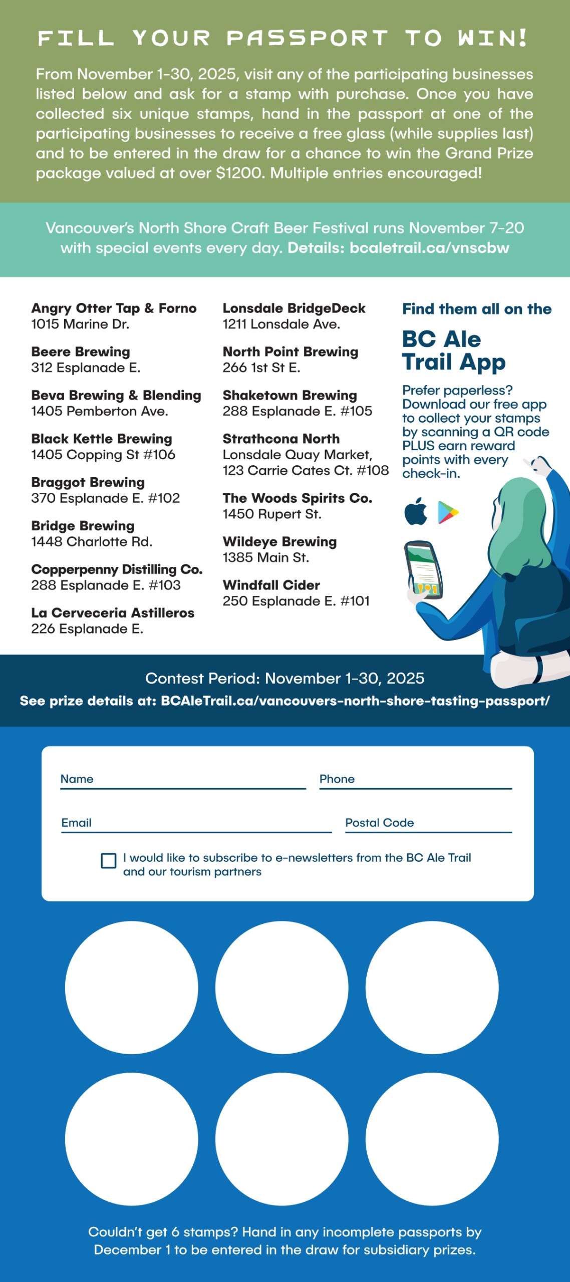 - Visit any of the participating businesses listed below from November 1-30, 2025 and ask for a stamp with purchase or collect a digital stamp by scanning the location’s QR code using the BC Ale Trail mobile app.